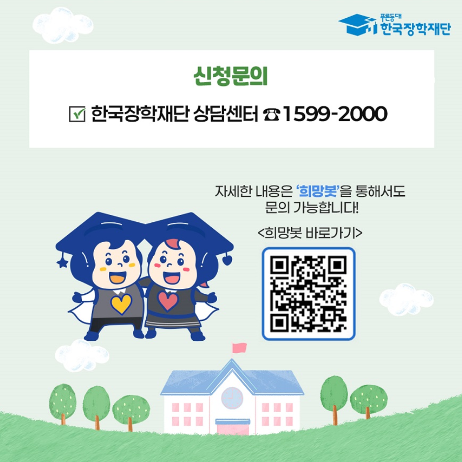 - 문의처: 궁금한 점은 한국장학재단 콜센터(1599-2000) 또는 웹사이트를 통해 문의할 수 있습니다.