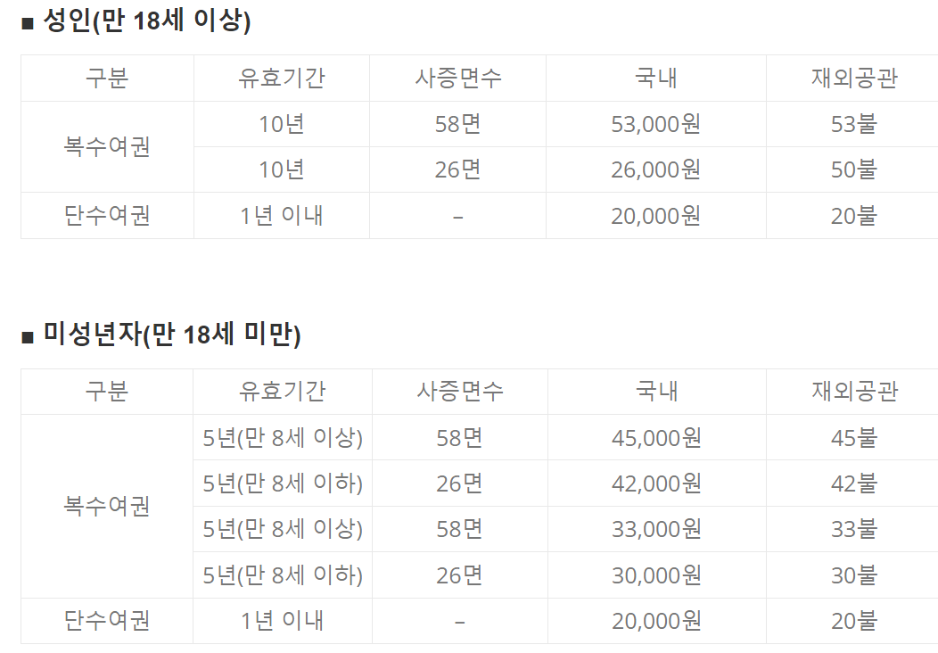 여권 유효기간 및 종류(10년/26면, 10년/58면, 5년/26면)에 따라 수수료가 다르게 적용됩니다.