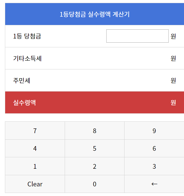 당첨금과 수령 방식을 입력하면 예상 세금과 실수령액을 간편하게 확인할 수 있습니다.